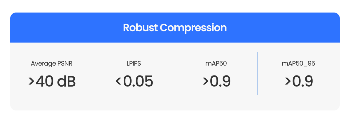 To further confirm this ML-safe process, we also observed robust performance across multiple industry-standard quality metrics, with Average PSNR values over 40 dB, LPIPS below 0.05 and both mAP50 and mAP50_95 well above 0.9.
