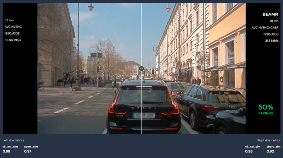 Beamr’s approach was validated across multiple benchmark tests. Rigorous testing with the NVIDIA AV infrastructure team delivered 23% compression improvement over current working point using the same codec, with up to 40-50% reduction when switching to HEVC or AV1. The rigorous testing used real-world AV footage, including challenging scenarios with complex camera configurations and diverse environmental conditions.